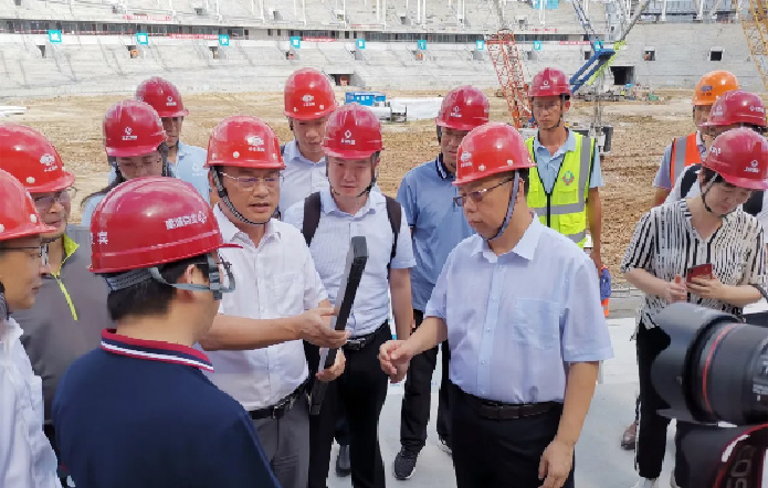 考察交流期间,岳清瑞等一行参观了三亚体育场屋盖索结构的施工进展和波形锚CFRP平行板索的应用情况,并就CFRP板索进行了现场交流。会上,中冶钢构华南公司三亚体育场项目经理金平首先对索结构的施工情况进行了汇报;中冶建研院科学技术研究院副院长刘晓刚博士对波形锚CFRP平行板索在三亚体育场内环交叉索中应用的技术背景以及研发、设计和制造等相关技术进行了技术汇报;设计单位北京市建筑设计研究院副总工朱忠义、研发团队成员北京工业大学副教授刘越、生产制造单位重庆达力缆索有限公司总经理卓静、索结构张拉提升施工单位东大预应力公司总经理罗斌、钢结构工程总包方中冶钢构总经理游志文等相关人员进行了交流和发言。