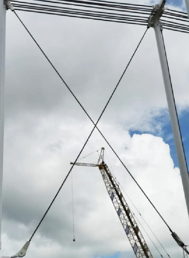 三亚体育场总建筑面积8.8万余平米,体育场屋盖为轮辐式索桁架结构,平面投影短轴224米、长轴261.8米,中心开口短轴134米,长轴171.8米。为提升结构抗风能力,屋盖结构布置内环交叉索;为降低内环交叉索对锁夹造成的不平衡力,该项目创新应用了强模比远高于普通钢索的CFRP平行板索,以新材料、新构件完美解决了结构问题。